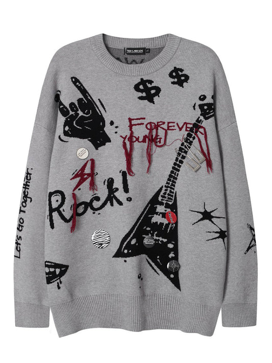Normal fiyat 1,499.00TLNormal fiyatBirim fiyat / /İndirimli fiyat 1,499.00TLEmbrace a rebellious edge with this punk rock-inspired knit sweater, designed for the ultimate rock-and-roll enthusiast. Crafted from a high-quality blend of 50% viscose, 30% nylon, and 20% polyester, this sweater offers both softness and durability, ensuring comfort and long-lasting wear. The front of the sweater showcases bold, artistic graphics, including electric guitar motifs, hand-drawn gestures, and distressed "Forever Young" slogans that enhance its edgy,... -