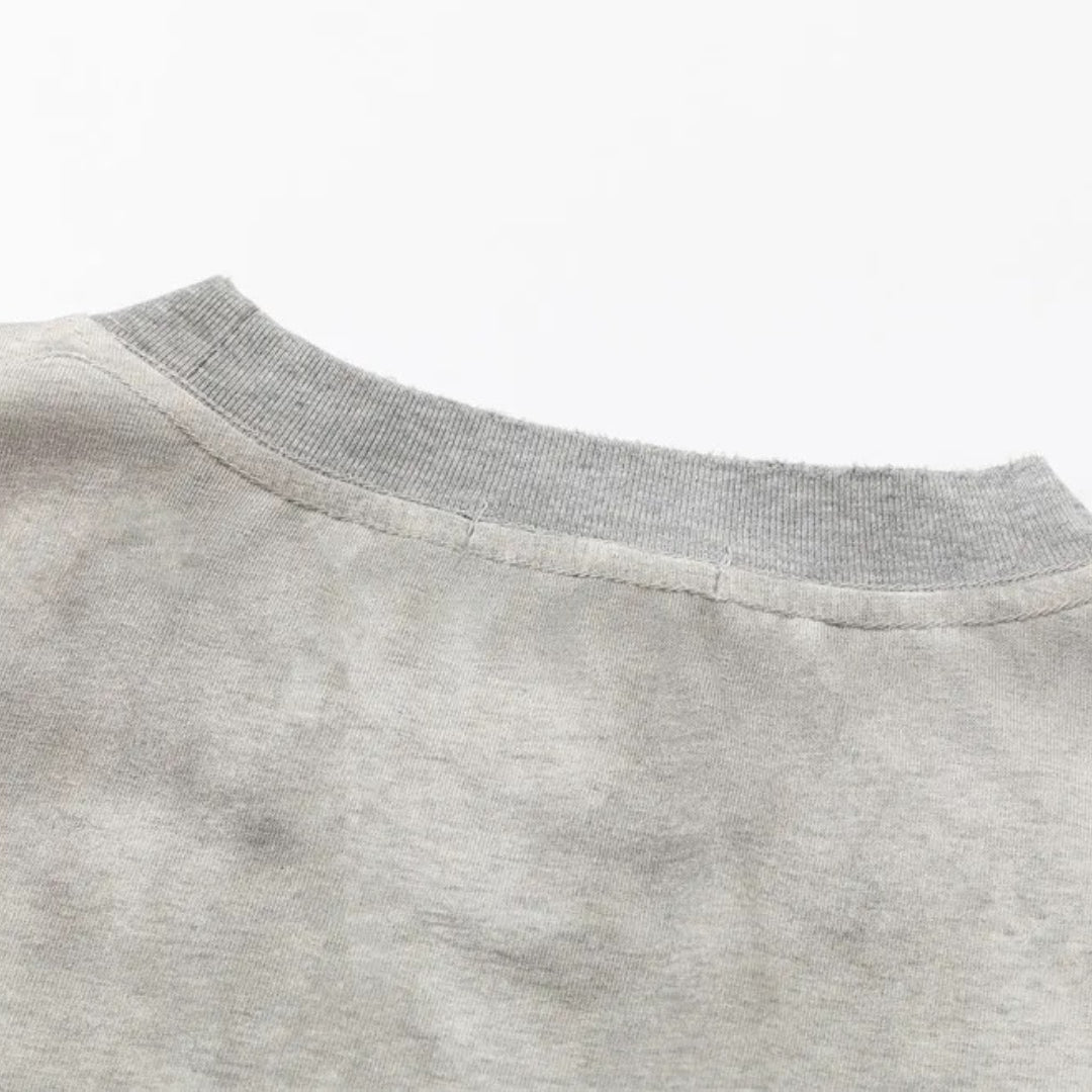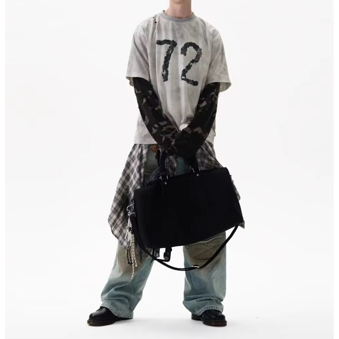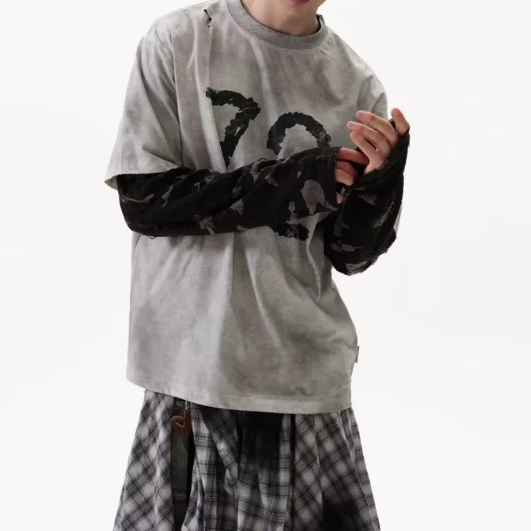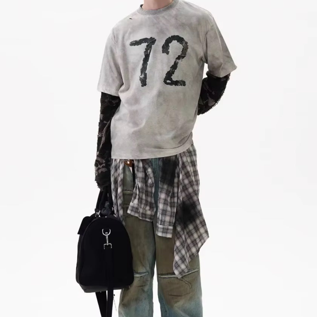 Distressed, bold and unapologetic, this t-shirt merges grunge and modern styles. The light gray, slightly distressed fabric features a bold 72 graphic, while long camouflage-print sleeves create a layered look. Ripped detailing around the neckline completes the rugged ensemble, embodying a perfect balance of individuality and sophistication.
