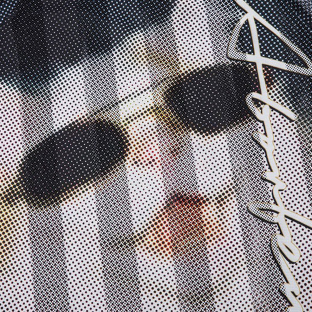 Cut from breathable technical mesh, this piece overlays a halftone-printed face with cryptic text and high-contrast graphics. The design flirts with distortion and nostalgia while maintaining sharp minimalism.