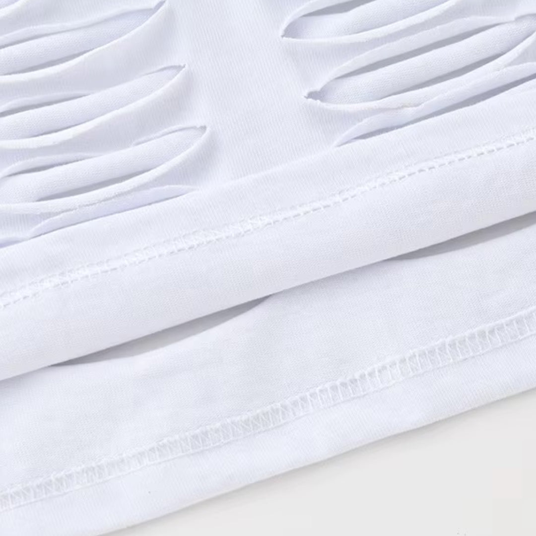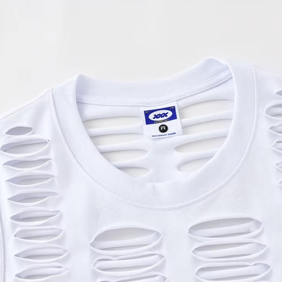 This vest is all about the details. Crafted from soft, breathable cotton that wraps around you seamlessly, it’s interrupted by bold splicing and raw, frayed edges that give it an unapologetically raw attitude. The open cuts are designed for airflow and movement, making it a standout piece to wear solo on hot days or as a perfect layering option when the night cools down.