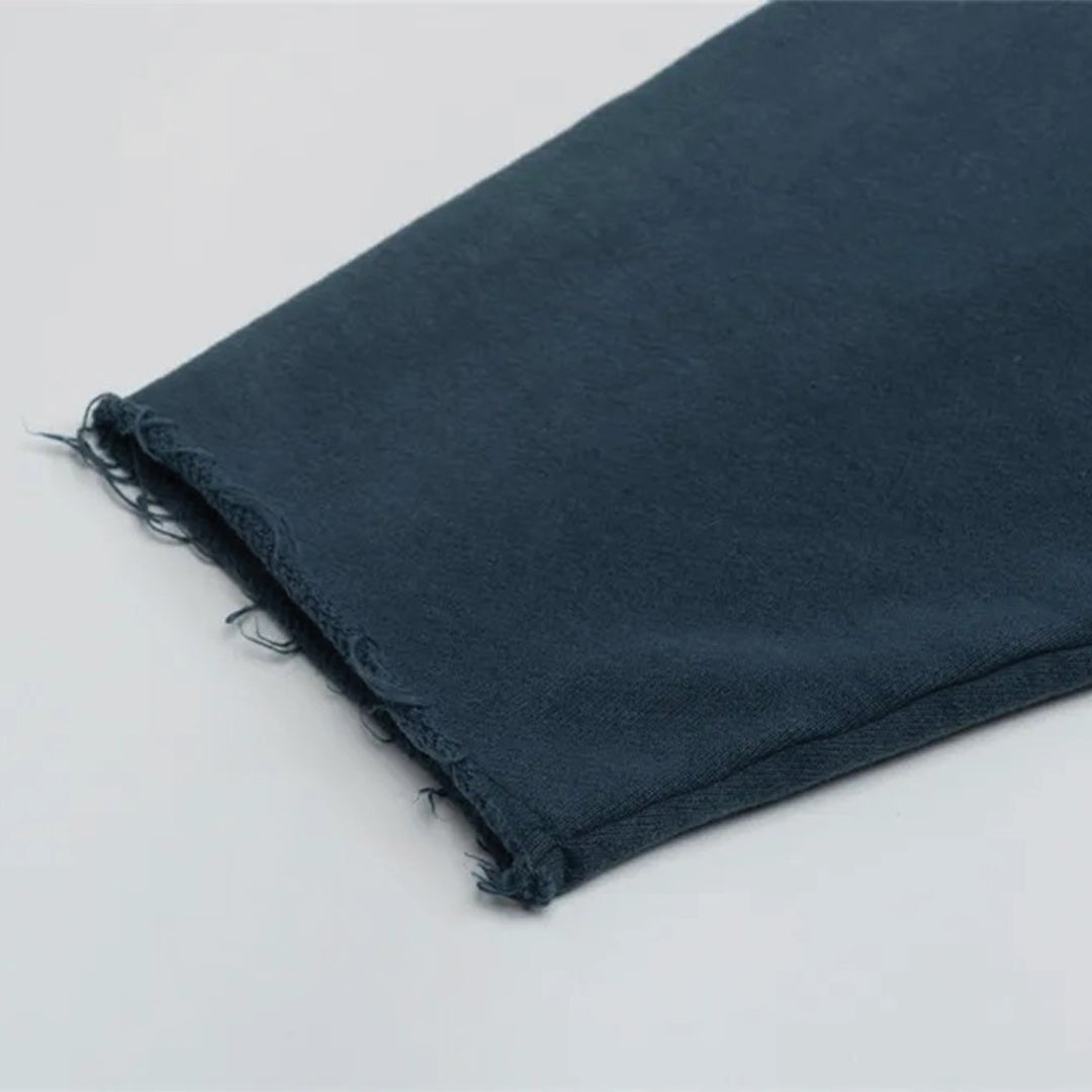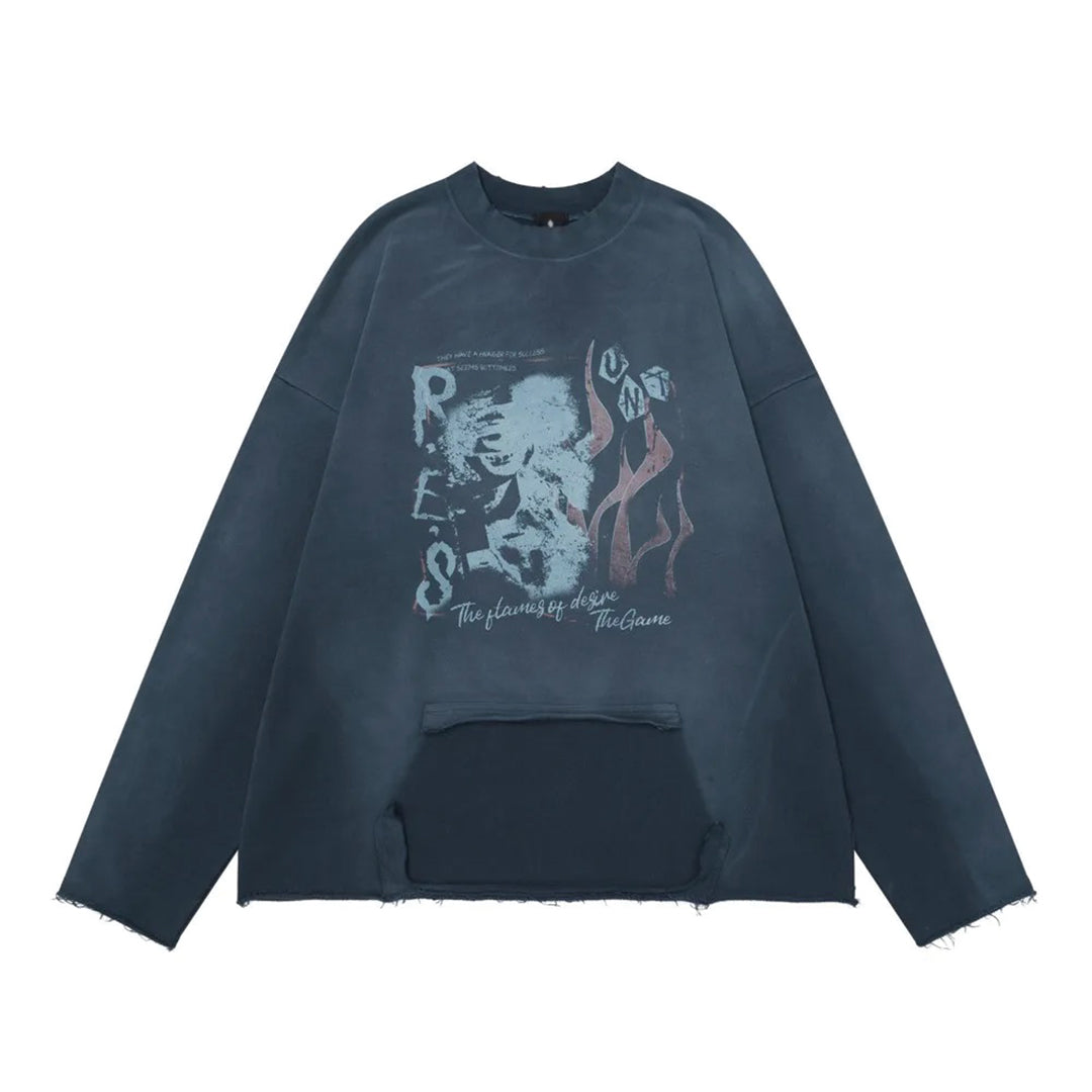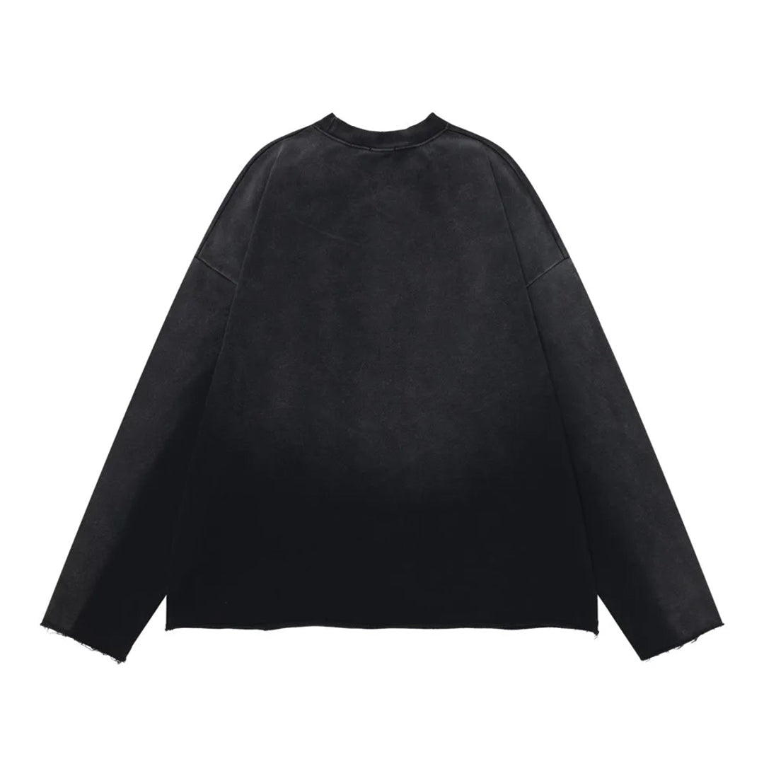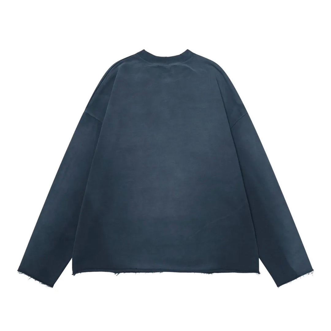 The deliberately distressed details and raw-edge finishing on this heavyweight cotton sweatshirt speak to fashion's ongoing romance with deconstructed streetwear. The oversized silhouette and carefully placed rips create a lived-in aesthetic that feels both authentic and considered.
