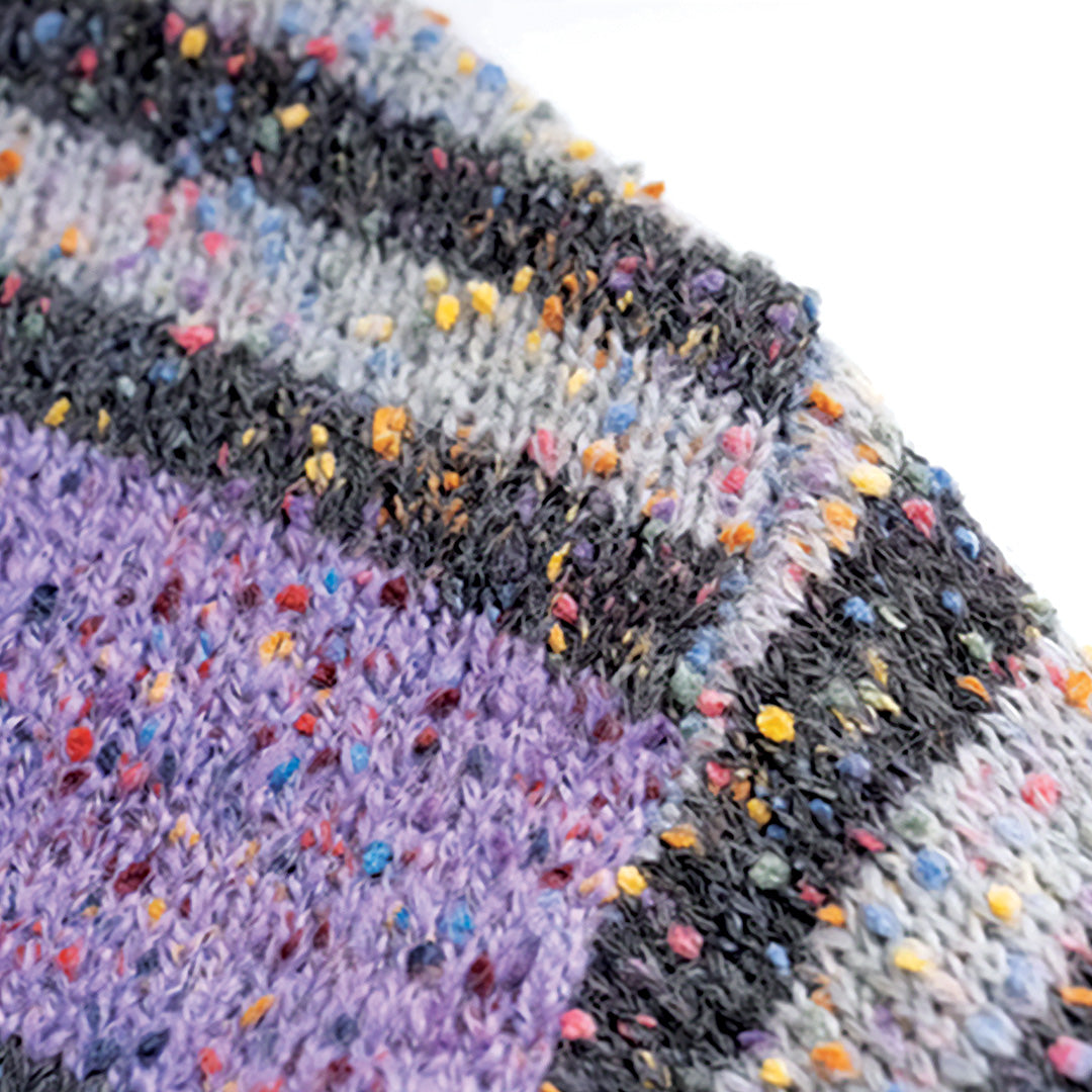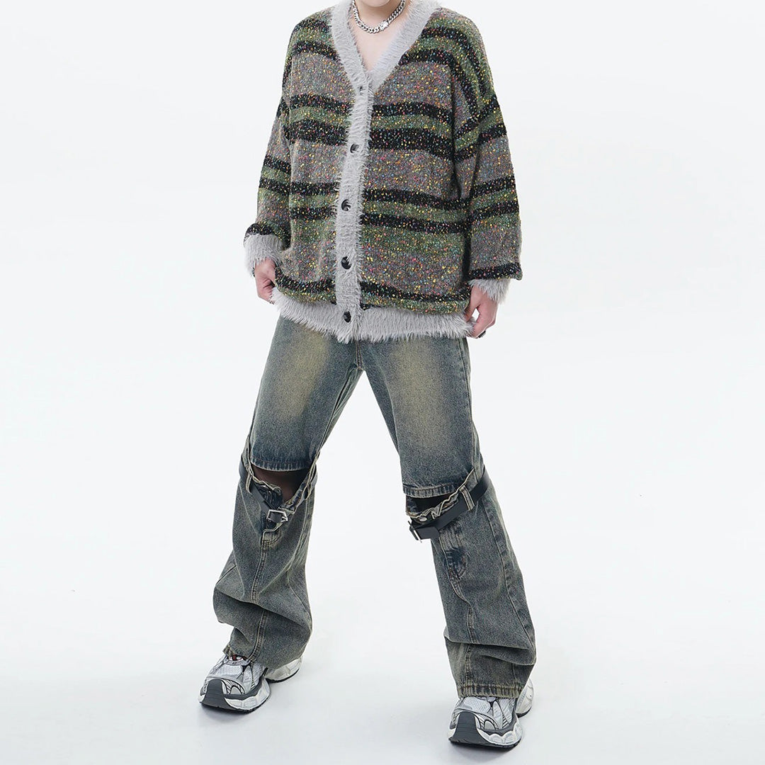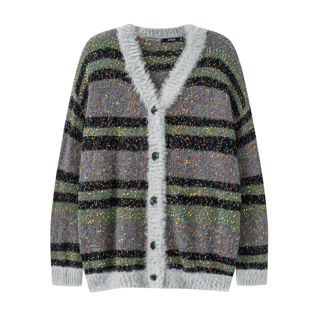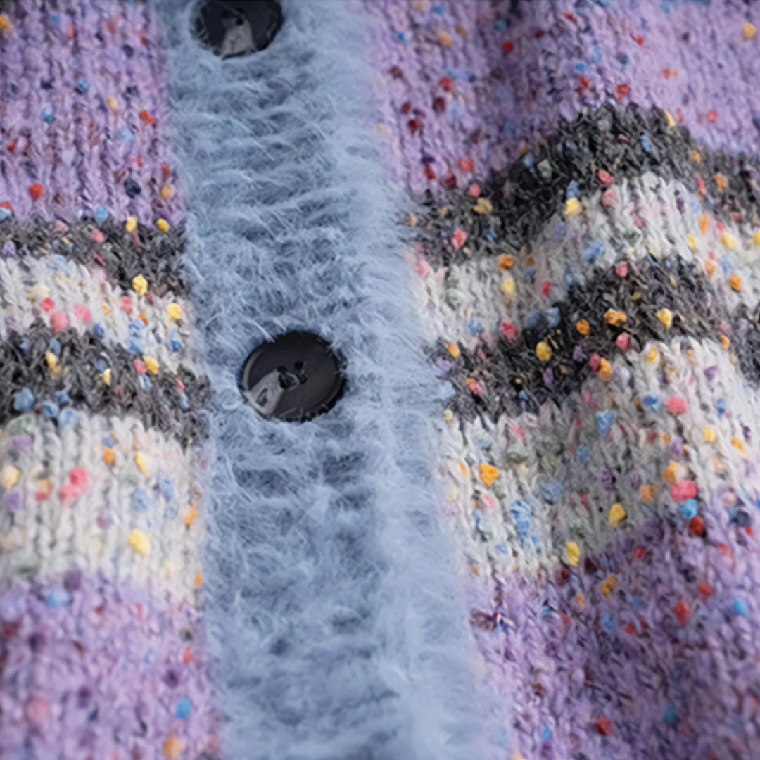 This colorful premium mohair cardigan effortlessly combines bold design with comfort. Featuring a striking blend of spots and stripes, setting this cardigan apart from more traditional outerwear options.