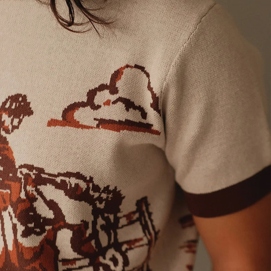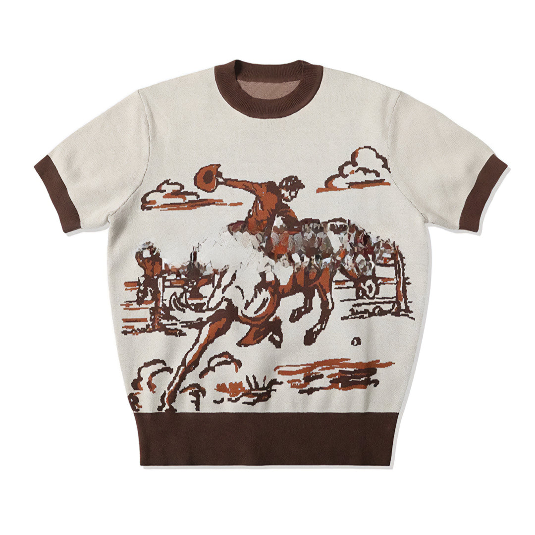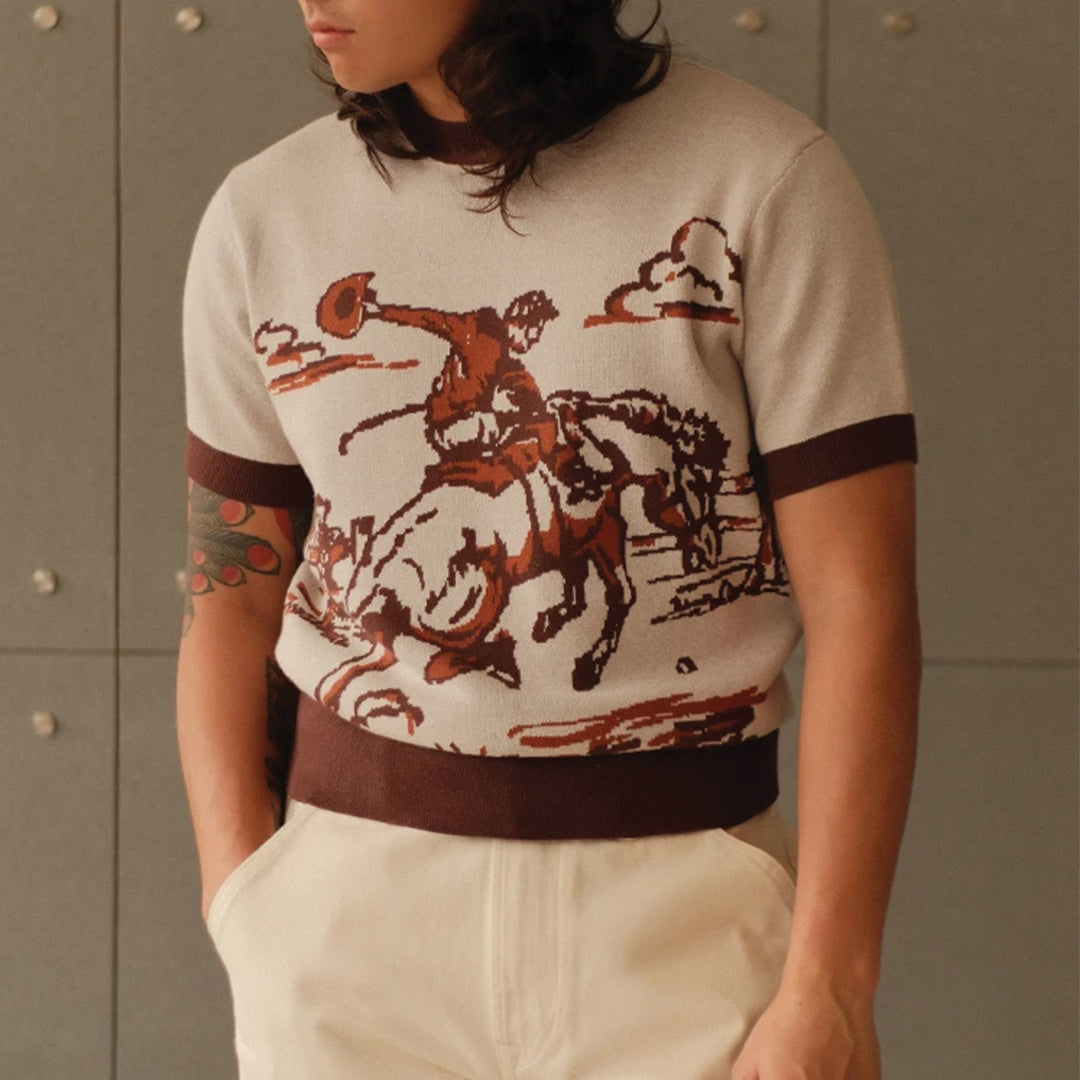 A knitted tee with a western horse motif channels a cinematic nod to open landscapes and old tales. The cropped, tailored silhouette works well styled with structured trousers or raw denim.