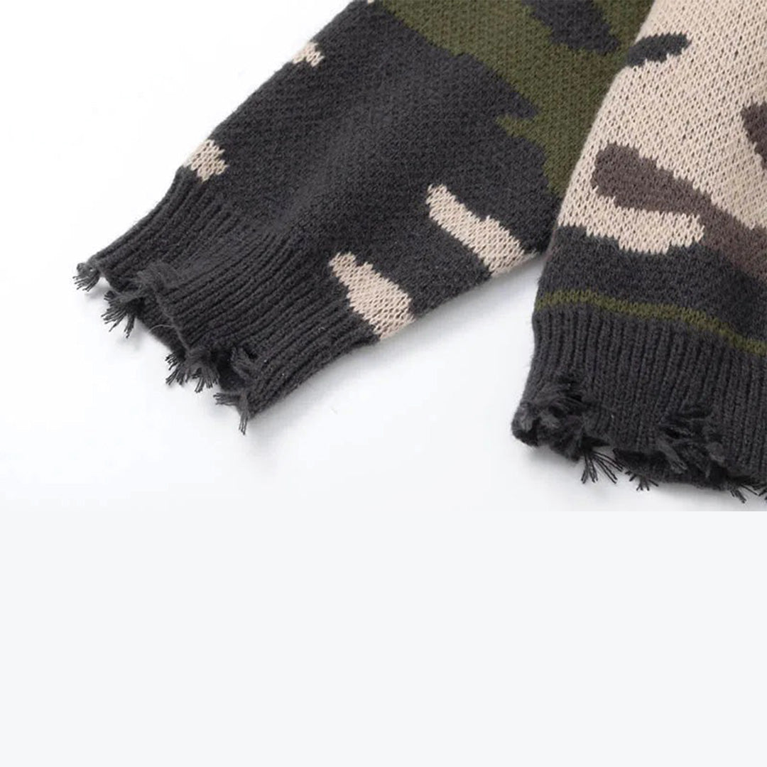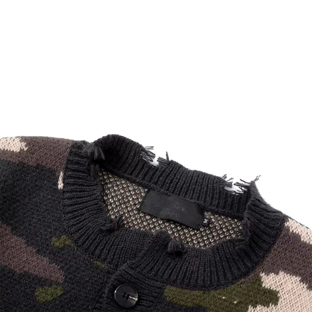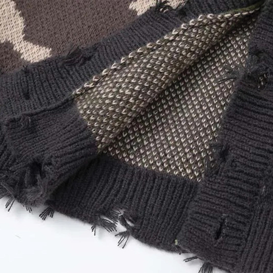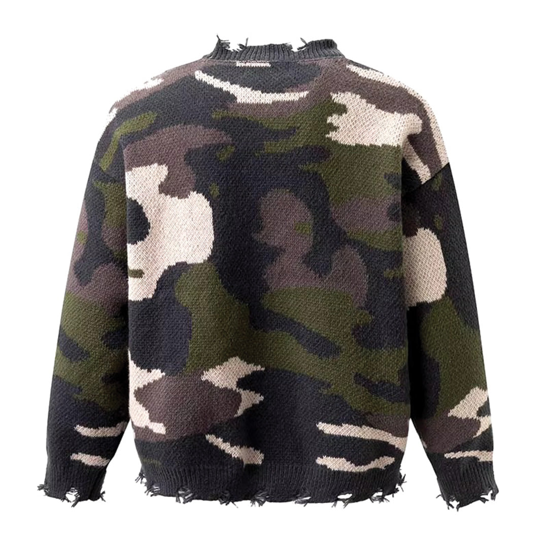 Combining rugged charm with modern refinement, this camouflage patchwork sweater is a standout in casual layering. The distressed details and textured knit elevate its appeal, making it a versatile choice for smart off-duty ensembles.