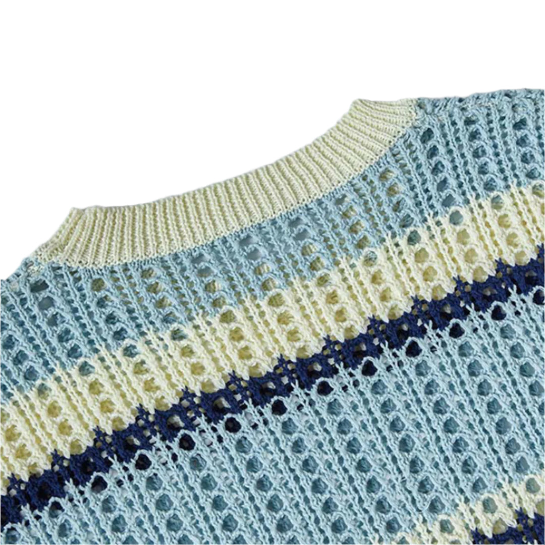 Breezy yet bold, this open-knit striped sweater brings effortless charm with its delicate crochet texture and refreshing palette. The relaxed fit and lightweight construction make it a perfect layering piece, blending vintage nostalgia with contemporary ease.