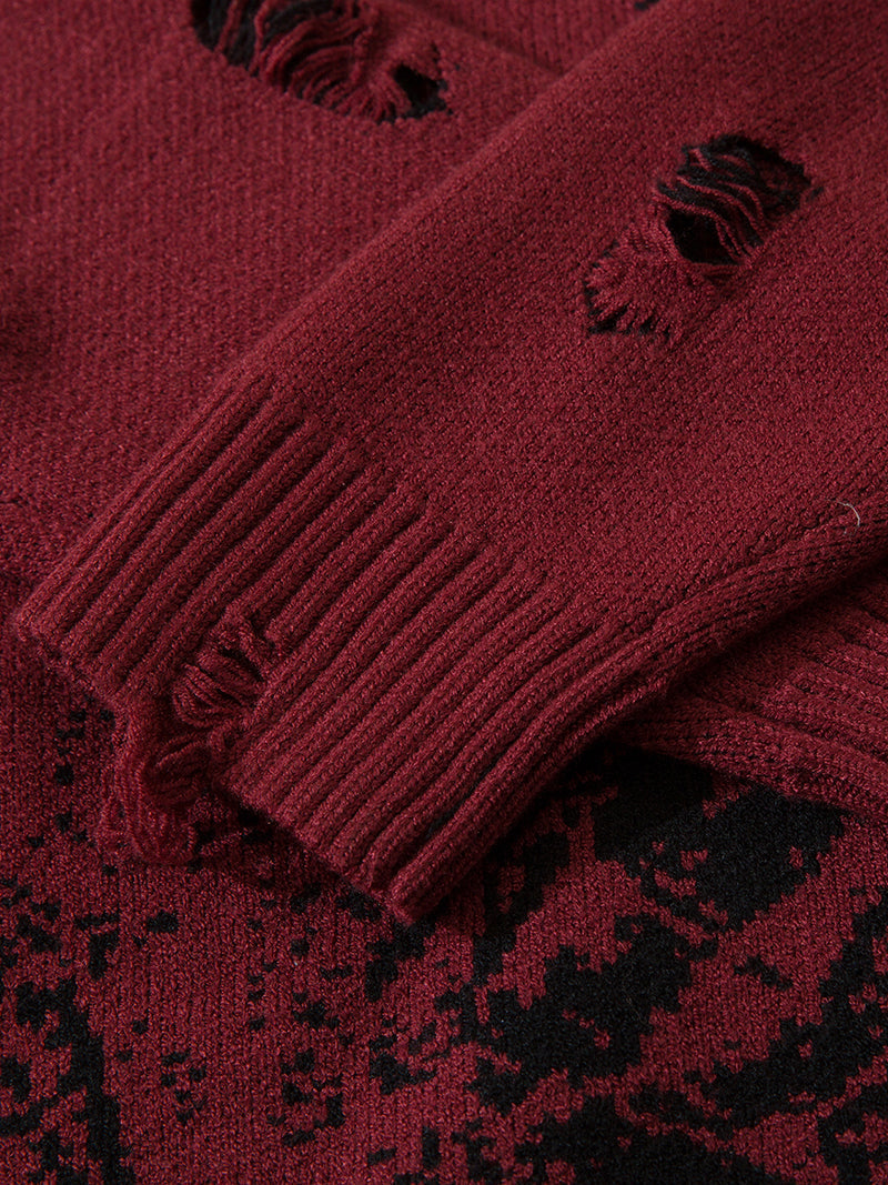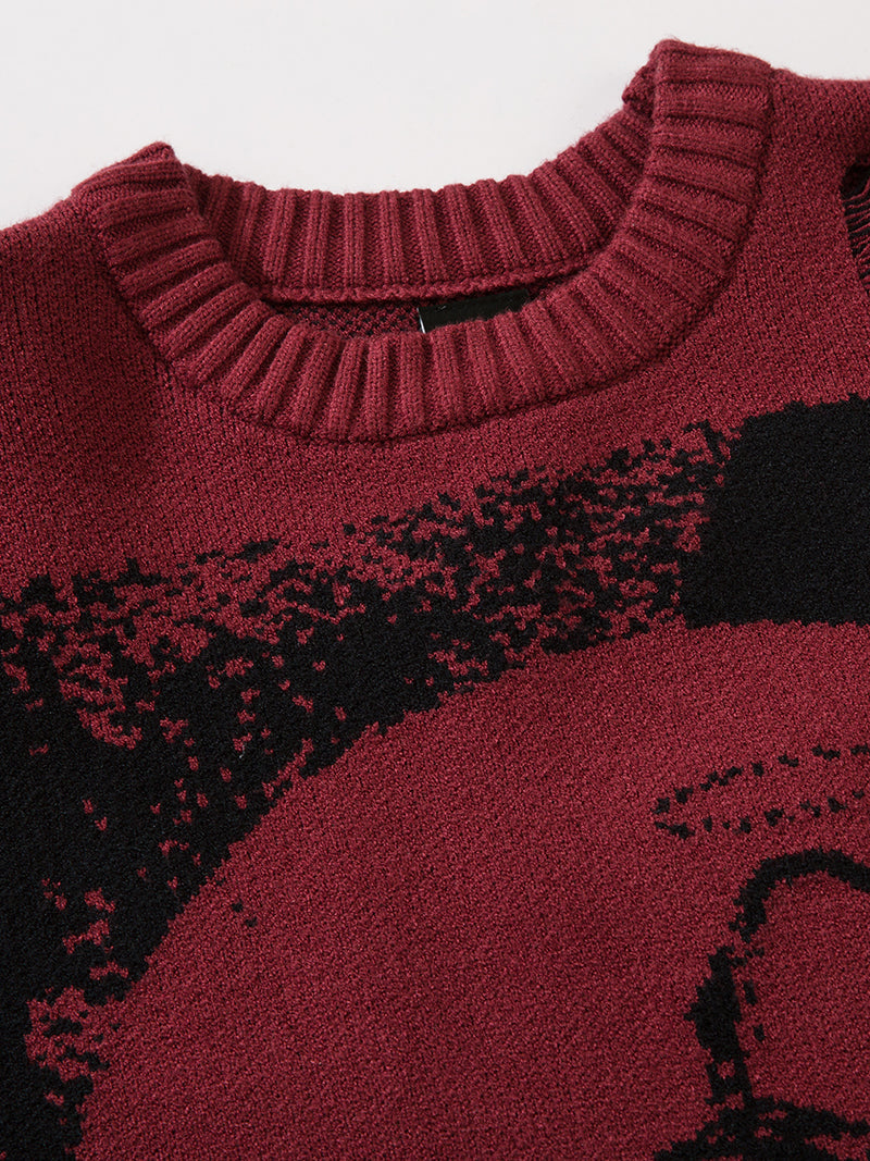 Elevate your wardrobe with this edgy and unique gothic-style sweater, perfect for those who embrace a darker aesthetic. Featuring a captivating hooded figure design, this sweater is adorned with distressed elements that add a rugged, lived-in look. Made from a comfortable and durable blend of materials, this sweater ensures warmth and style throughout the cooler seasons. Available in multiple colorways, including deep red, black, and charcoal gray, it's an ideal choice for casual outings, concerts, or making a bold fashion statement.