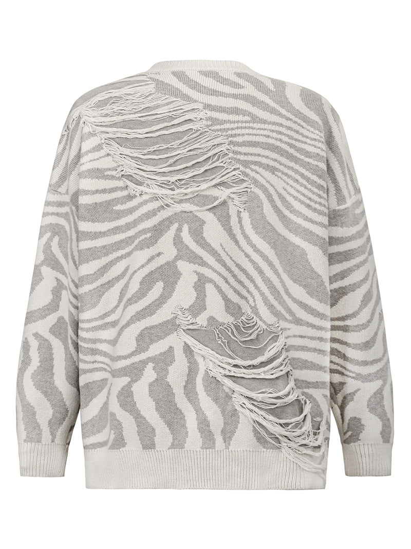 Distinctive Design: Stand out with a dynamic zebra pattern, enhanced with carefully placed distressed sections that give this sweater a trendy, worn-in look.