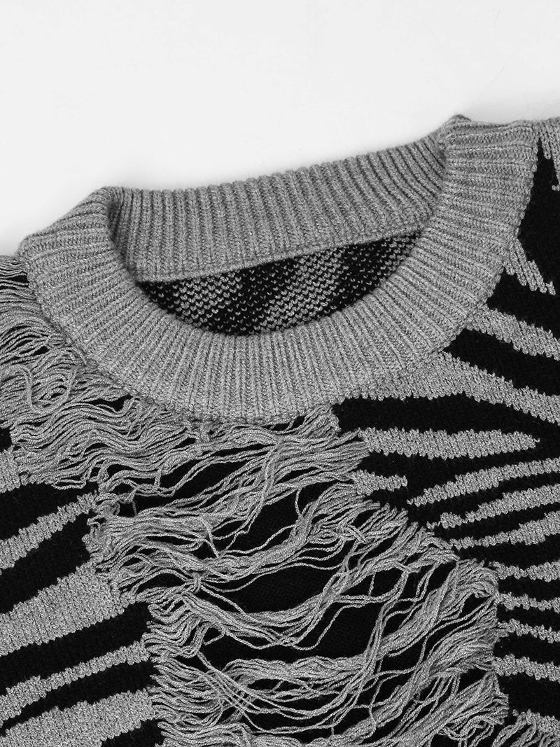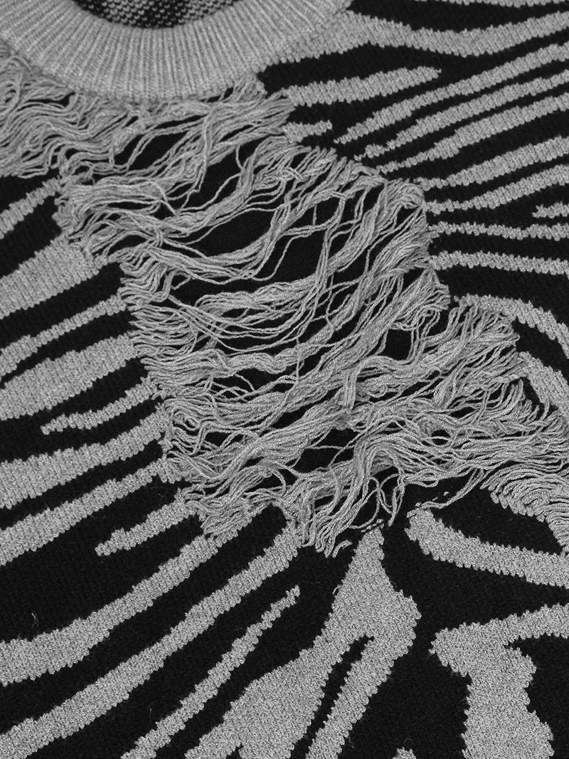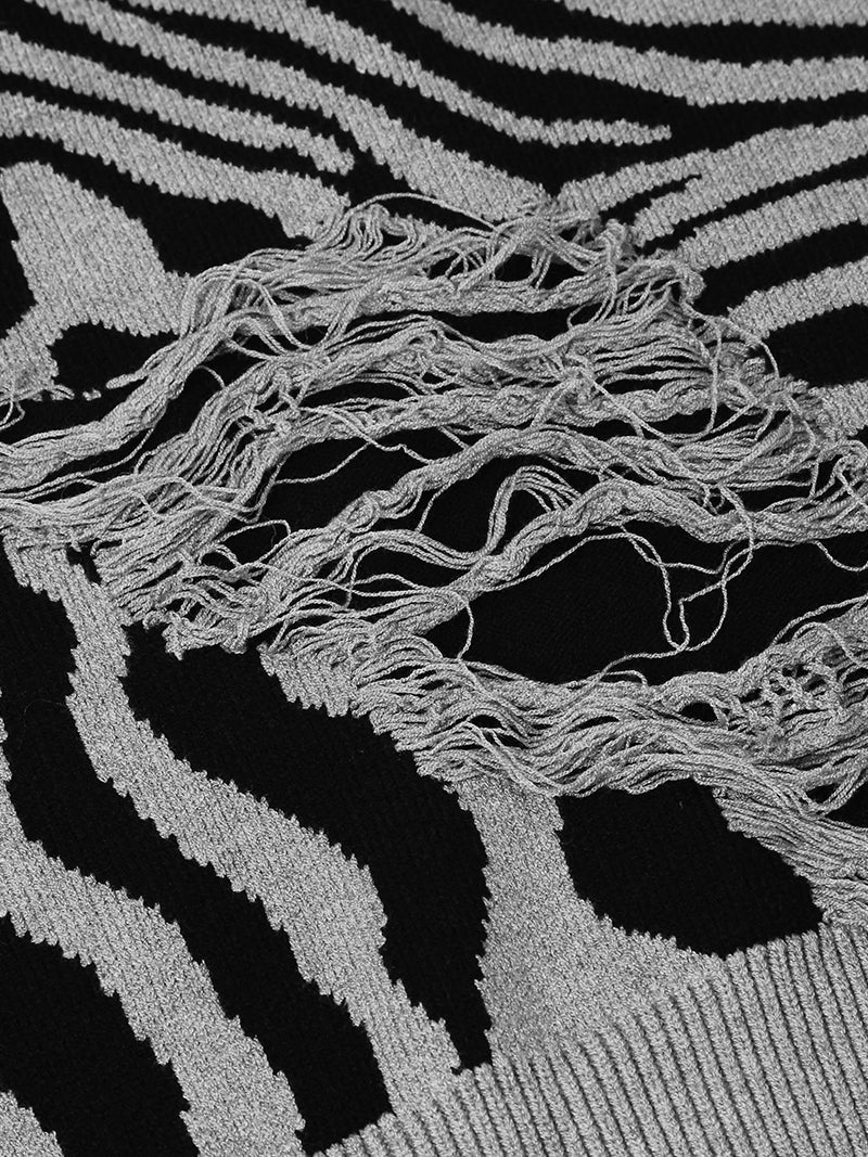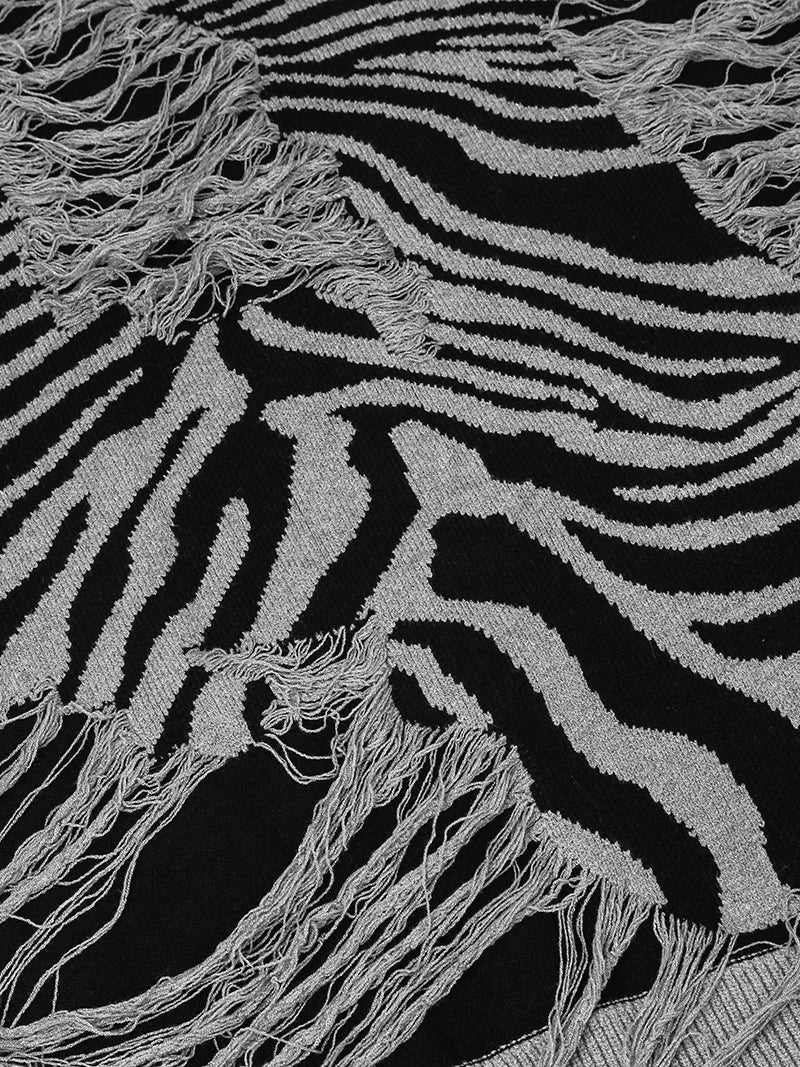 Elevate your casual wardrobe with this uniquely designed zebra-striped sweater, perfect for those who appreciate bold fashion statements. Crafted from a high-quality blend of materials, this sweater combines style and comfort in a seamless way. The eye-catching zebra print is complemented by distressed, shredded detailing, adding an edgy, contemporary flair to a classic knit.