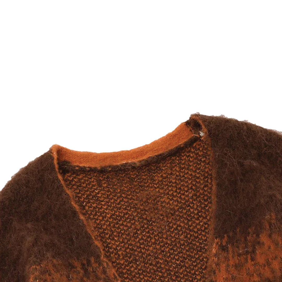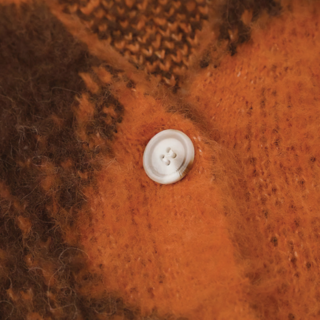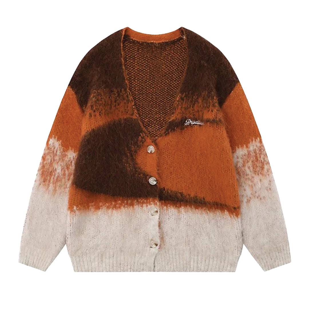 This vintage tie-dye cardigan is a sophisticated take on casual wear, blending a tie dye pattern with the elegance and comfort of a soft wool blend knit. The V-neck and single-breasted button closure offer a refined touch.