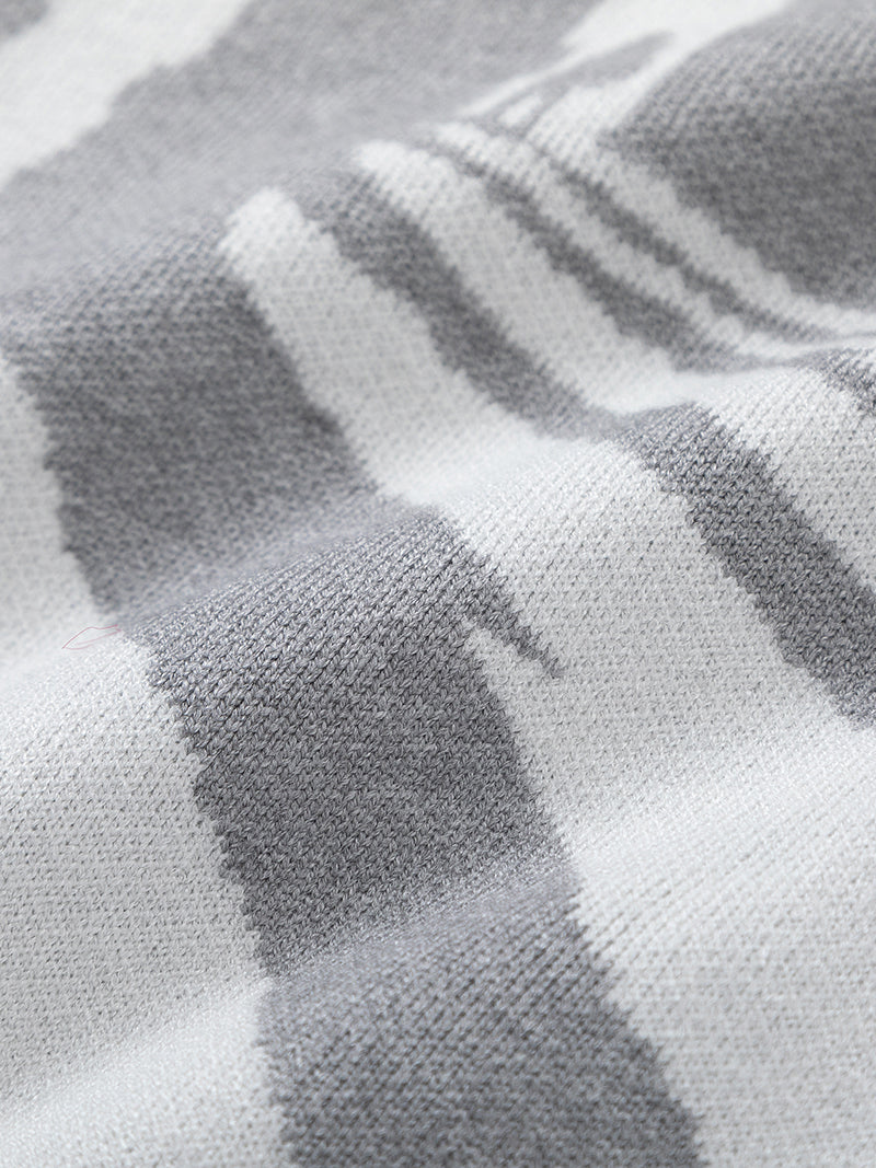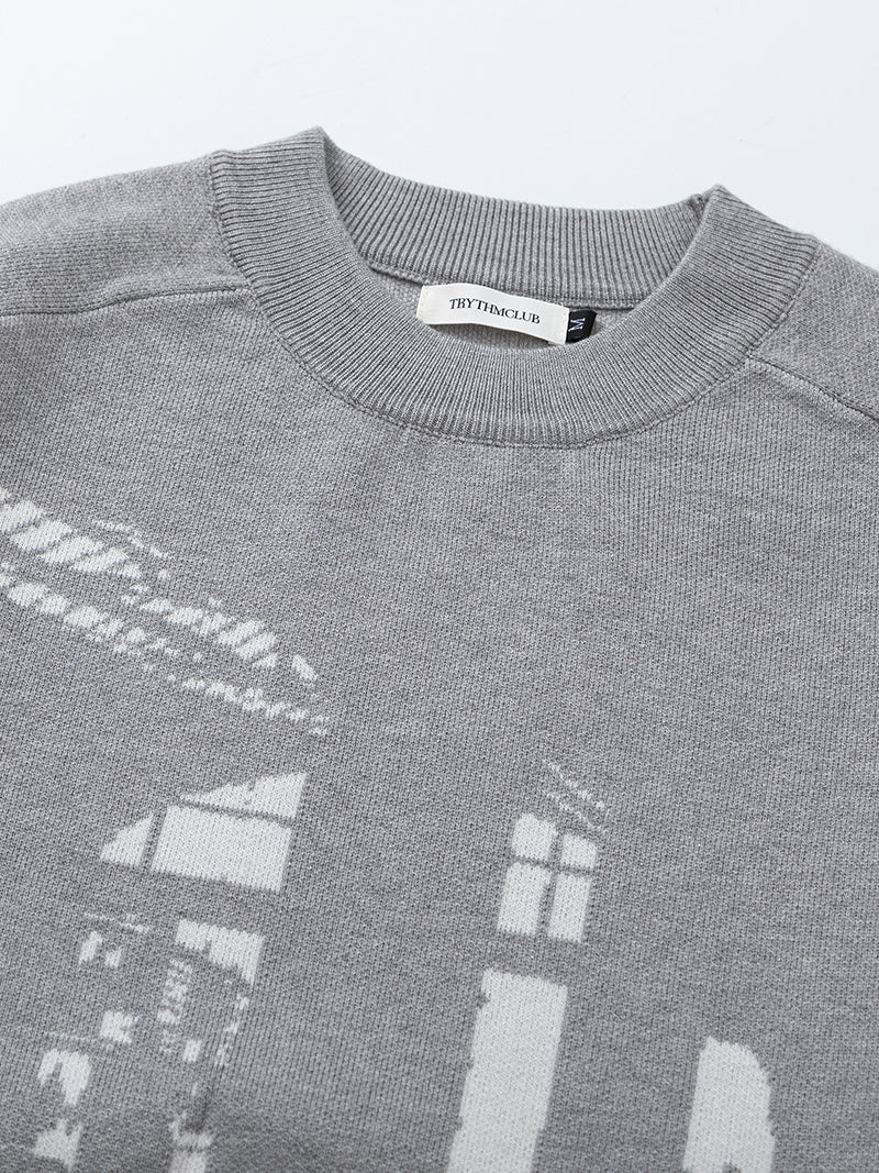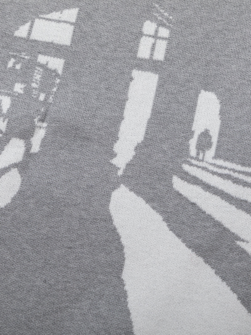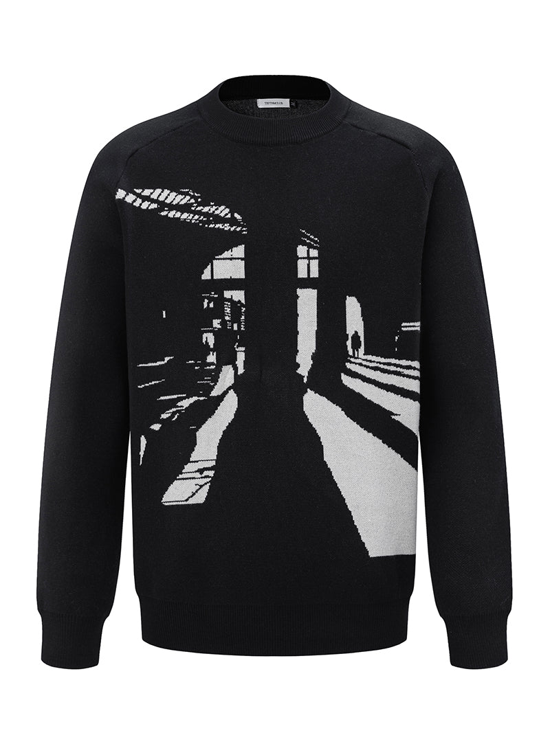 Abstract Cityscape Design: The sweater features an abstract silhouette of buildings and shadows, evoking the feel of a modern urban environment. The design is not tied to any specific famous building, allowing it to convey a general sense of city life.