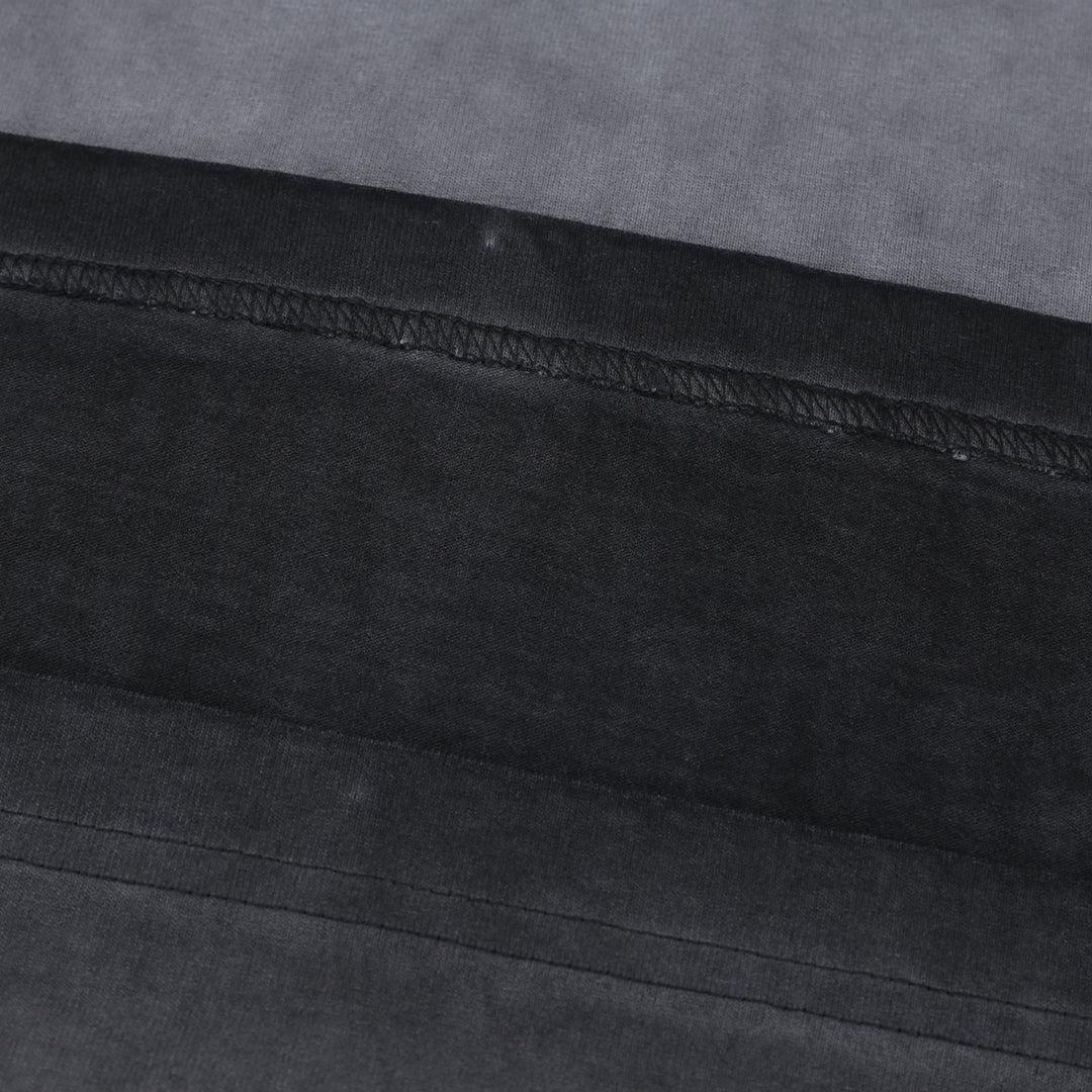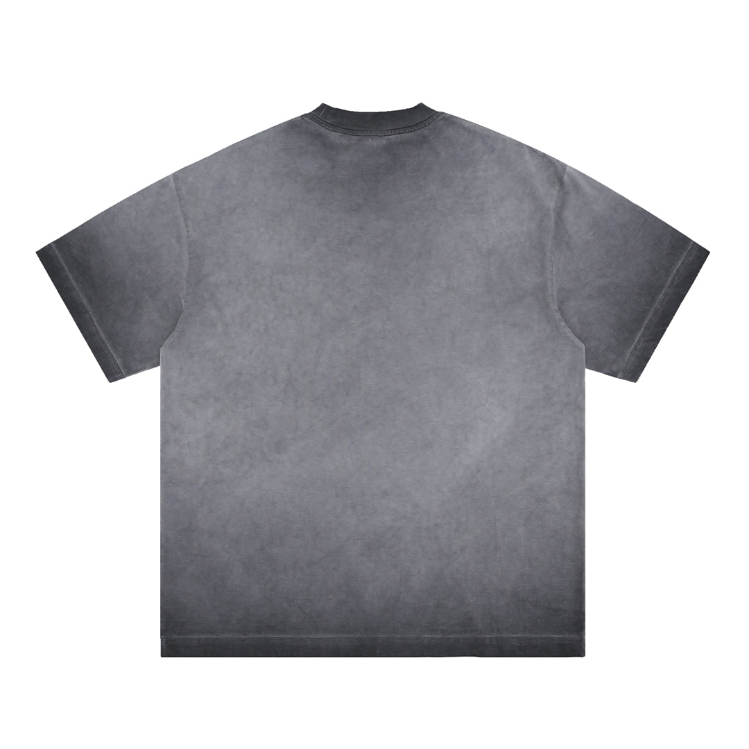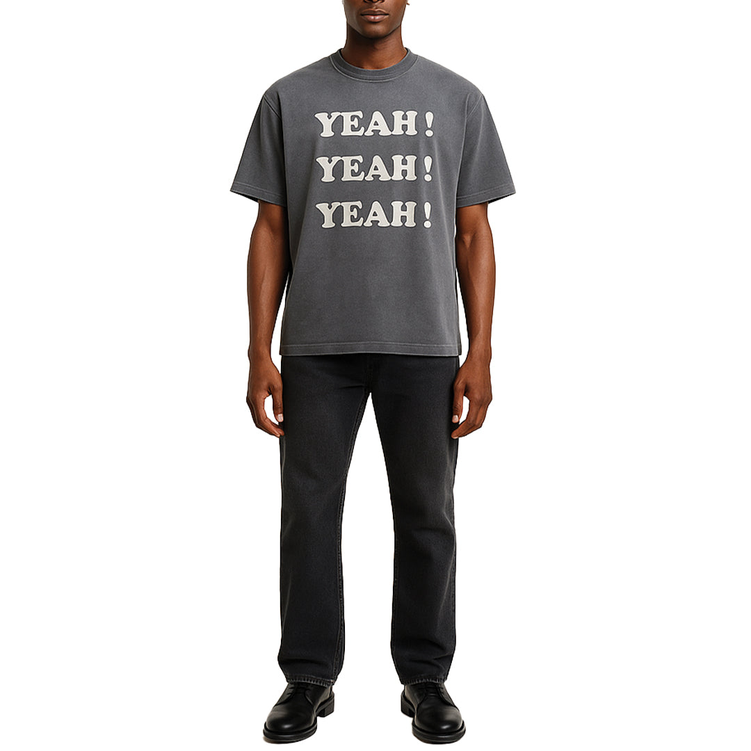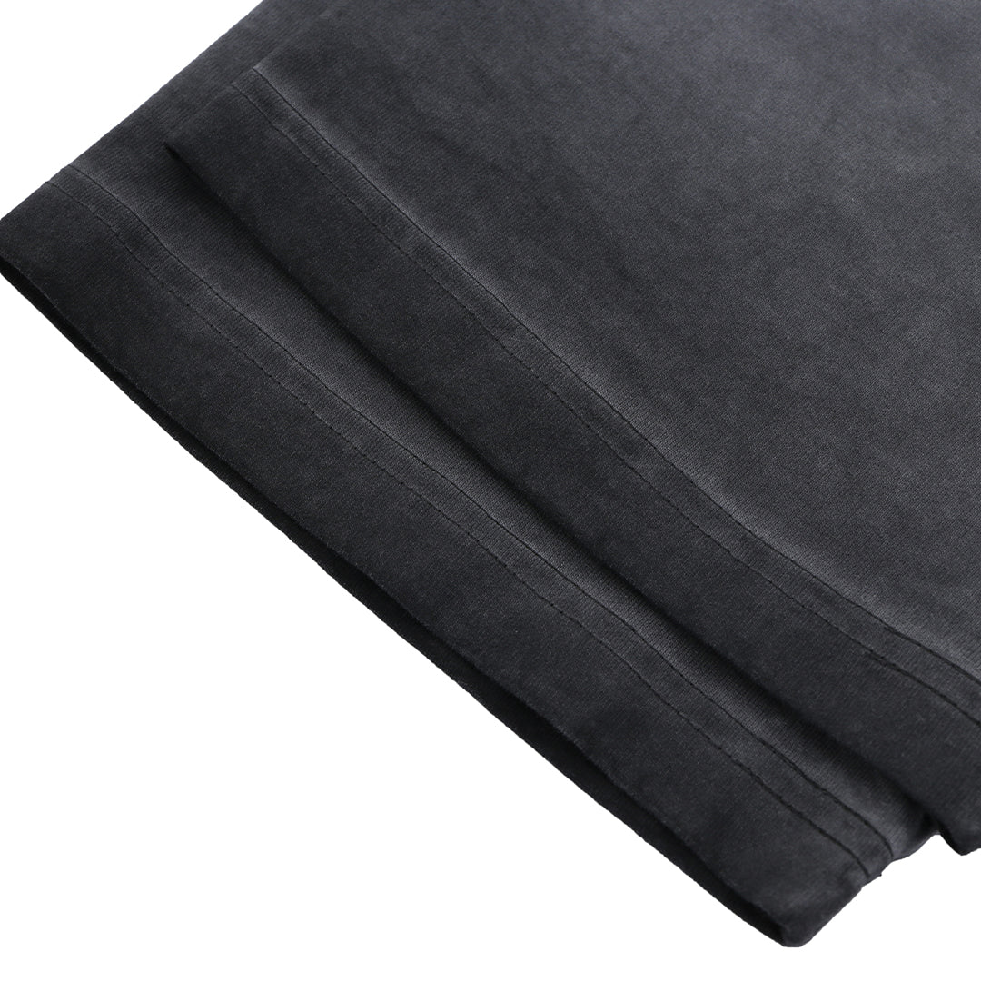 A washed black tee that shouts without saying too much. Bold type, faded finish—this piece punches through the noise with punk simplicity.